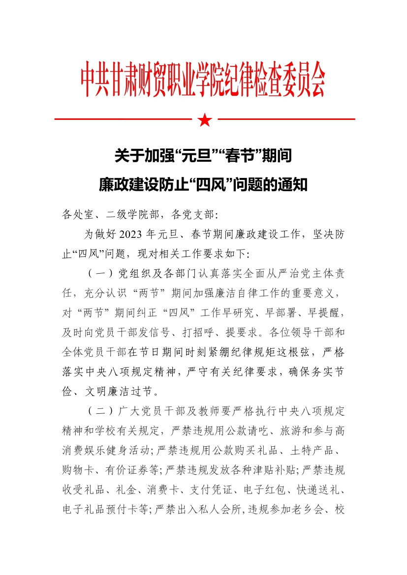 关于加强“元旦”“春节”期间 廉政建设防止“四风”问题的通知