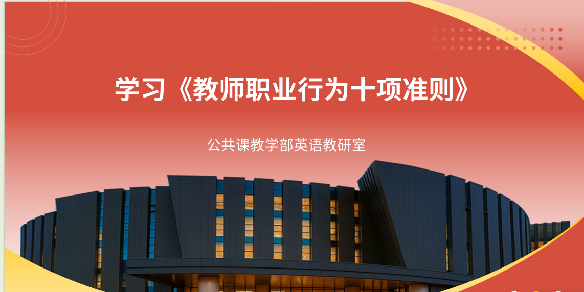 2025年9月11日下午,英语教研室在第一教学楼213会议室举行专题学习会,全体教师齐聚一堂,集中学习教育部印发的《新时代高校教师职业行为十项准则》。本次学习旨在进一步强化教师职业道德意识,规范教育教学行为,推动师德师风建设常态化、制度化。
