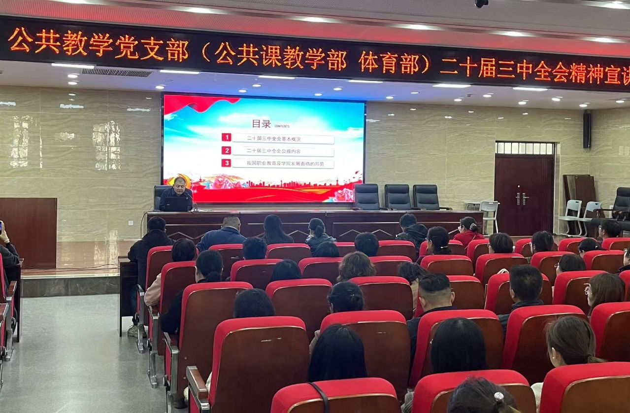 2024年11月15日,yl88858cc永利官网副院长何科鹏为公共教学党支部(公共课教学部、体育部)讲党课,党课主题为:二十届三中全会精神宣讲会。宣讲会分别从二十届三中全会基本概况、二十届三中全会公报内容、我国职业教育及学院发展面临的形势展开。