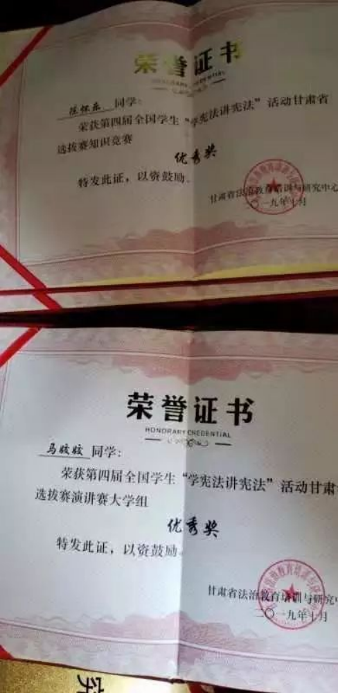 10月16日上午,由省教育厅主办,甘肃政法大学、青少年法治教育中心、甘肃省法治教育培训与研究中心承办,省高级人民法院、省人民检察院、省司法厅、西北师范大学协办的第四届全国学生“学宪法 讲宪法”活动甘肃省选拔赛开幕式在甘肃政法大学举行。此次活动以“尊崇宪法、学习宪法、遵守宪法、维护宪法、运用宪法”为主题,共有来自全省14个市(州)的207名大中小学生参赛,比赛分为演讲赛、知识竞赛两种形式,从10月16日开始持续到10月19日结束,最终选拔出的优秀选手将代表甘肃省参加第四届全国学生“学宪法 讲宪法”活动竞赛决赛阶段比赛。我院思政课教学部寇明英老师带领“思政课教学改革试点班”学生马姣姣、摆小兰、19级新生陈怀乐、魏万坤4位同学参加了竞赛。经过师生共同努力,最终我院获得“最佳组织奖”!4名学生获得“优秀奖”。