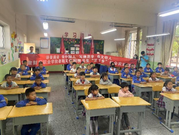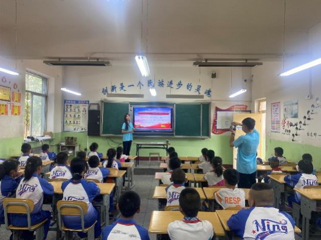 宣讲团成员举行了“红领巾心向党”主题宣讲会,成员通过讲述党史故事和小朋友交流互动,传承红色精神。“讲好普通话,做好中国人”主题宣讲会上,成员们带读朗诵“走进七月流火的季节”,帮助小朋友纠正普通话发音。最后实践团队为小朋友们送去自制的手绘短袖和学习大礼包。