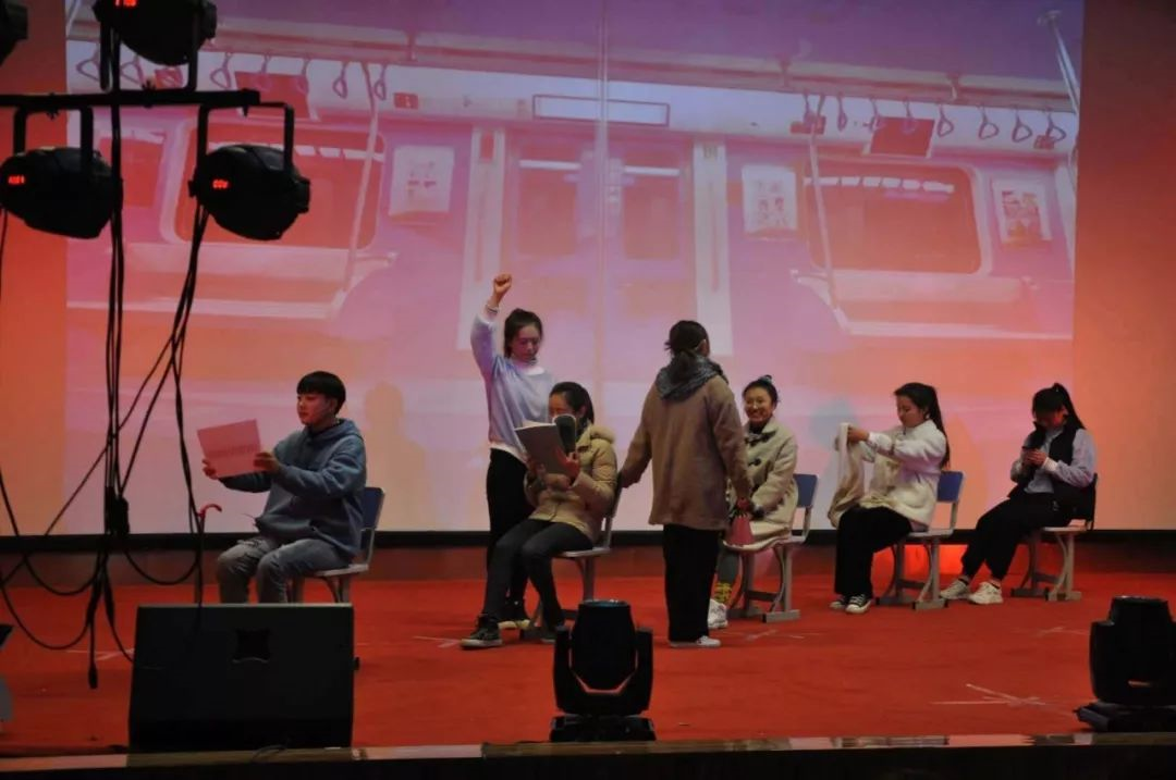 会计系的同学们用小品《地铁上的故事》告诉同学们公共场合,向陋习告别,与文明同行,做可爱公民,遵守法规,各行其道,互相礼让,安全文明。知荣耻、守规矩、畅交通、保平安。