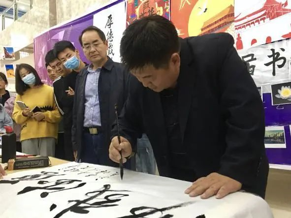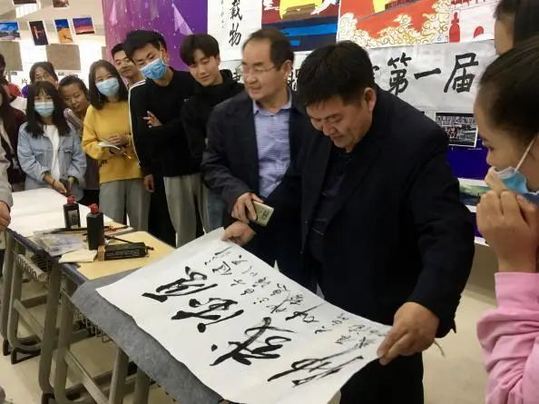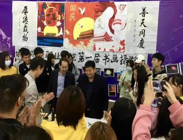 作为本次“校园文化艺术节”系列活动之一的“大学生书画摄影作品展”9月24日下午在第一教学楼西大厅展出,学院院长周和平,副院长郭志强在百忙之中莅临现场参观学生书画作品。参观过程中,周院长、郭院长对本次学生书画作品展出的优秀作品给予肯定。同时,也希望同学们再接再厉,继续勤加练习,创作出更多优秀的书画、摄影作品。参观结束之际,郭院长即兴为在场同学题字---《厚德载物》,借此勉励在场学生在校培养高尚的品德,努力成为德才兼备的优秀财贸学子。