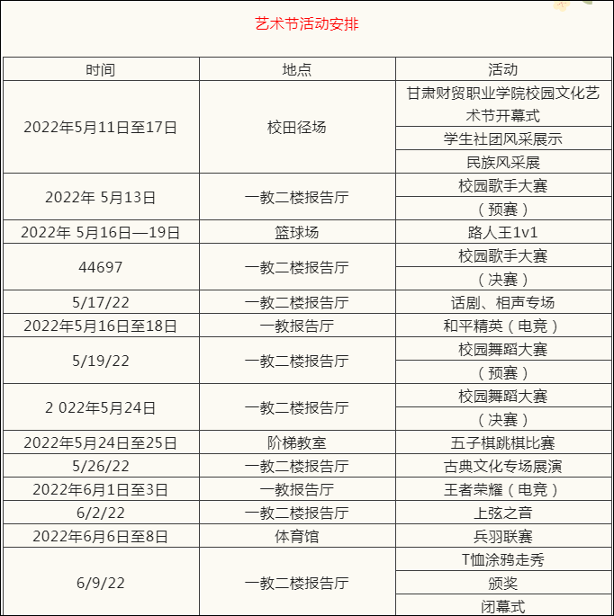 一年一度的校园文化艺术节是一张靓丽名片、一道美丽风景、一次盛大节日。艺术节活动将持续到6月份,期间通过一系列丰富多彩的主题活动,不断引导学生强化思想和文化素质,培养创新精神和实践能力,全面助力学生成长成才。