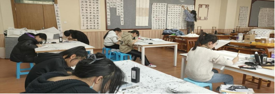 在书法室,指导教师根据赛事要求,耐心讲解赛事规则和专业技能知识,并亲身示范。同学们认真聆听、潜心研究,针对专业技能问题与指导教师共同讨论,并在教师指导下专注练习。