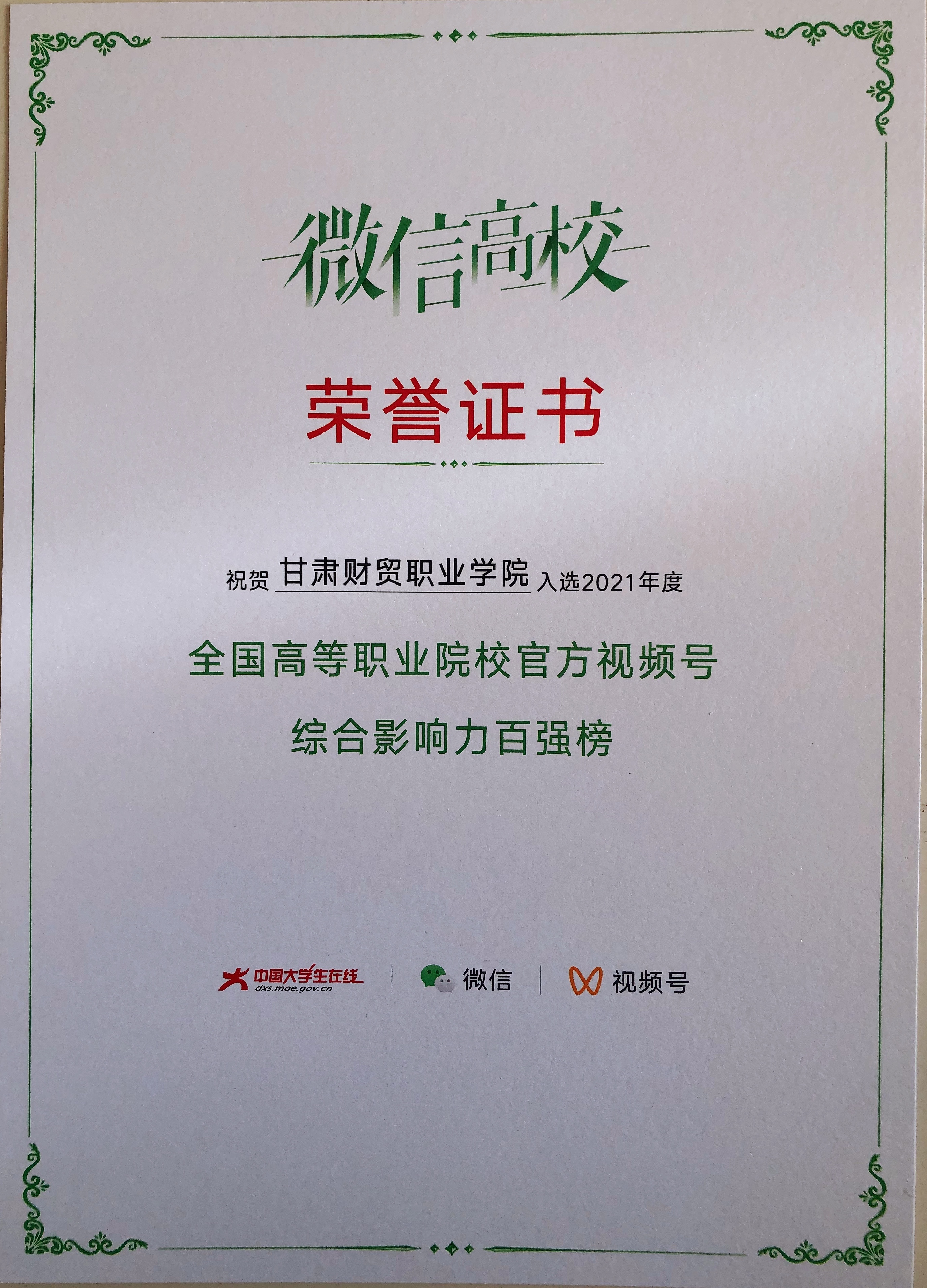 作为荣获“全国高等职业院校2021年度官方视频号综合影响力百强榜“荣誉称号的甘肃省两所高职院校之一,yl88858cc永利官网于2021年创建官方视频号,官方视频号是我院继打造官网、微信、微博等新媒体后,把握全媒体时代传播触点,发展全程、全息、全员、全效媒体的新尝试,是学院构建全媒体传播新格局、努力实现全媒体时代新闻宣传工作的最大化和最优化的新举措。视频号以服务广大师生、传播财贸好声音,展示财贸新形象为方向,精心运营。今后我院也将以荣誉为基础,自觉承担起举旗帜、聚民心、育新人、兴文化、展形象的使命任务 ,抒写宣传工作新篇章。