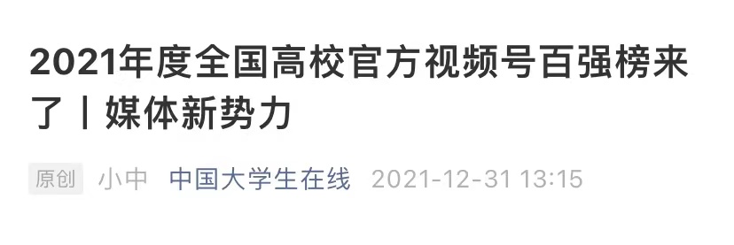 为更好地展现全国高校在媒体融合时代运用短视频助力网络思政工作的创新探索,充分发挥引领示范作用,由教育部主办,高等教育出版社承办,国内最大的面向全国大学生开展思政工作的主题教育网站——中国大学生在线推出“全国普通本科院校2021年度官方视频号综合影响力百强榜”“全国高等职业院校2021年度官方视频号综合影响力百强榜”“2021年度高校优秀视频号单项奖”。