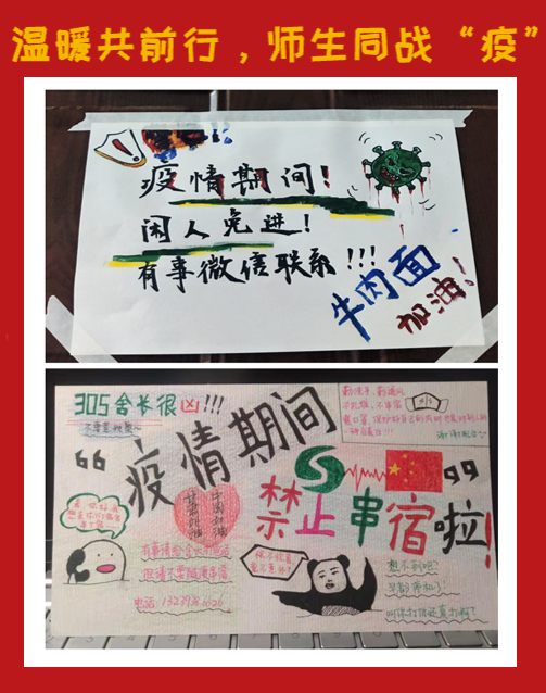 可爱的同学们在宿舍门上贴起了各有特点的防疫宣传画,用自己不一样的方式表达着疫情情防控的决心。