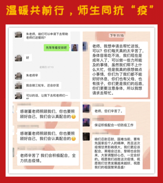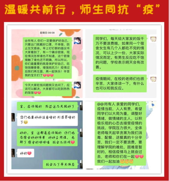 班主任、辅导员每天通过班级微信群、钉钉群,召开线上班会向同学们传达学院疫情公告,强调疫情防控知识,让同学们务必做好自身防护,同时了解同学们思想动态,生活需求,做好同学们的心理疏导工作。