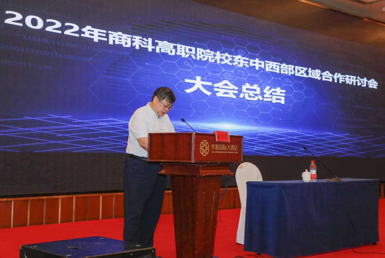 第五阶段由山东商业职业技术学院党委书记张志东进行大会总结。他在总结中指出,研讨会规模大,是一次难得的学习机会,专家们的报告对于开展商科专业教育,有序推进商科院校东中西部合作具有很强的针对性、实践性,达到了明确方向、统一思想,振奋精神、凝聚力量、团结一致,激励奋进的目标,是-次团结的大会,统一思想的大会,成功的大会,胜利的大会。