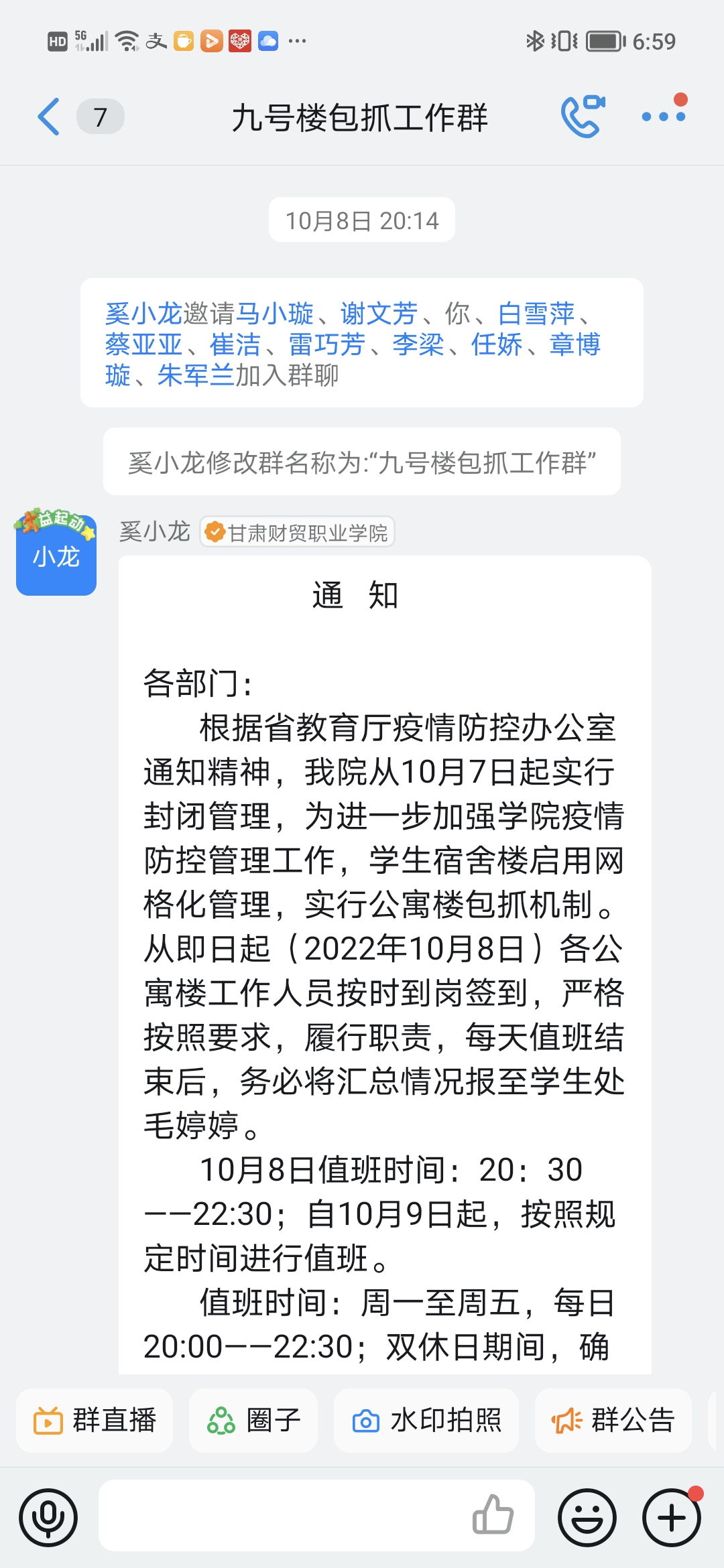 根据学校疫情防控工作任务分工,包抓专责组9号楼楼长第一时间联系各楼层层长,并建立钉钉信息群,发挥楼长作用,及时安排任务,力所能及地做好“第一响应人”。