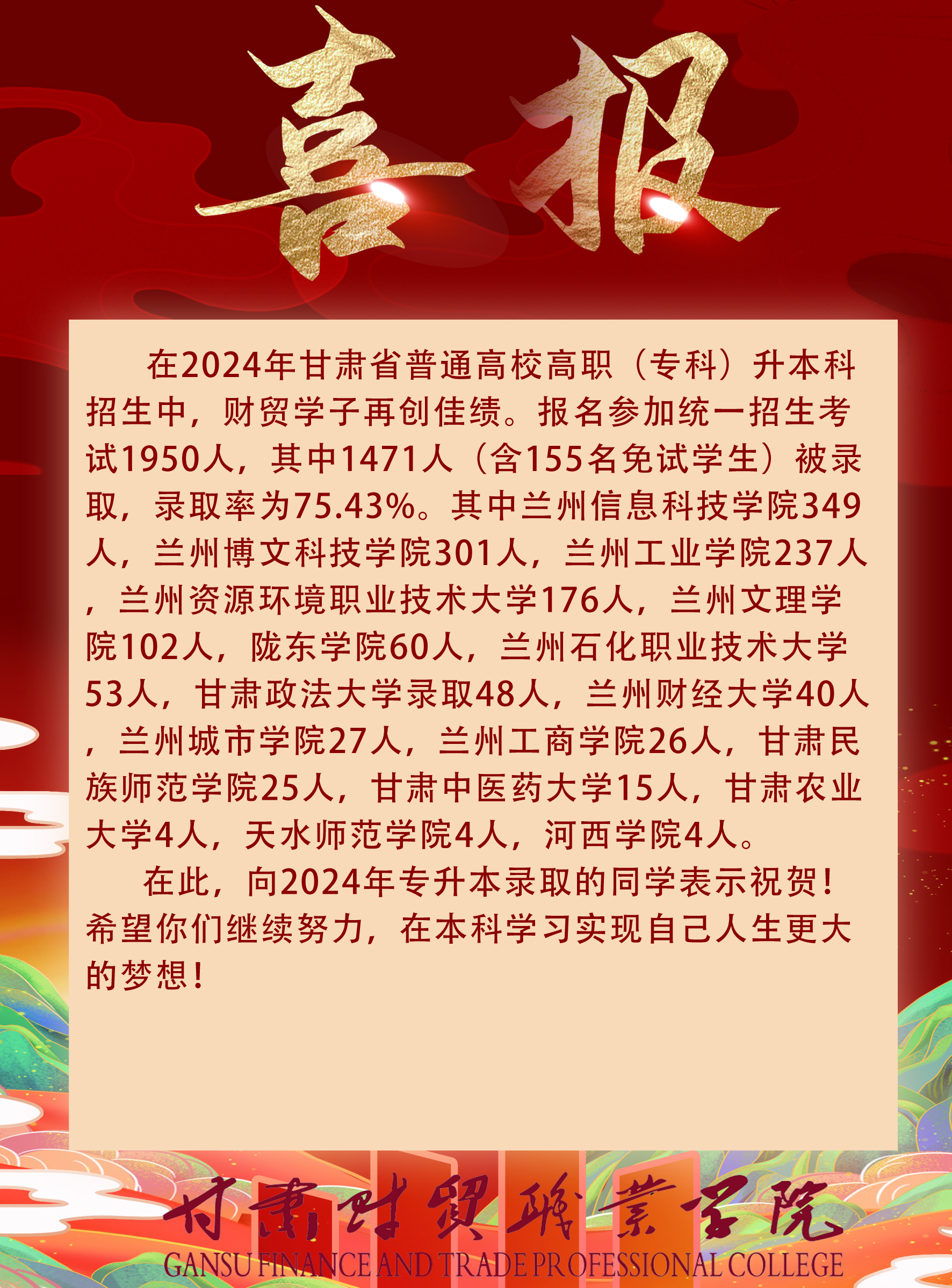喜报|2024年甘肃省普通高校高职(专科)升本科招生中,财贸学子再创佳绩