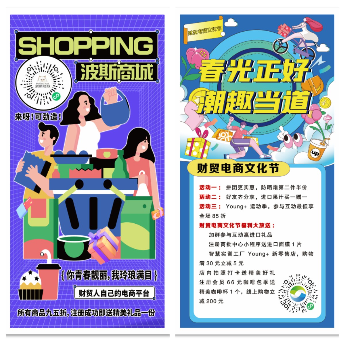 本次活动以“春光正好 潮趣当道”“波斯商城-财贸人自己的电商平台”线上+线下的方式开展,通过此次活动向学生们推广电子商务文化,普及电子商务知识;吸纳对电子商务感兴趣的同学学习电子商务实战技巧及互联网思维。本次活动以“融合梦想,赢在未来”为主题,通过新商科智慧工场,开展校园O2O营销实战;培养同学们的创业、营销、服务意识。