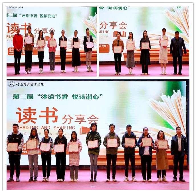 经过阅读和分享,经济管理学院任美丽获一等奖,赵文娟获二等奖,邹佳欣获二等奖,薛海丽老师和徐仰颉老师获优秀指导教师奖;同时,经济管理学院荣获优秀组织单位称号。学院领导为获奖个人及二级学院颁奖,并与读书爱好者合影留念。