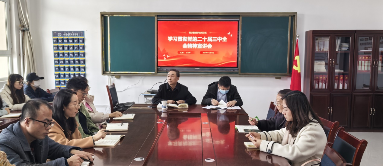为学习贯彻党的二十届三中全会精神,2024年11月12日下午,联系经济管理学院校领导王志坤校长宣讲党的二十届三中全会精神,经济管理学院党总支书记主持会议,全体党员及入党积极分子参会。