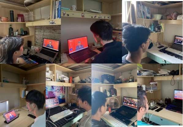 经济管理学院的学生们在宿舍里,通过新媒体、新闻网站等多种形式收听收看党的二十大开幕会。