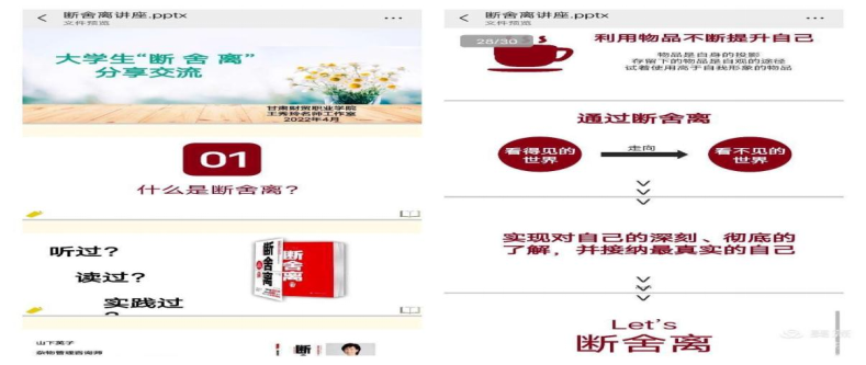 活动第一阶段:组织线上腾讯会议,由王秀玲名师工作室展开“断、舍、离”理念植入,帮助学生更好的整理宿舍内务。同时发放关于大学生“断舍离”的问卷调查,截止4月20日收回问卷359份。