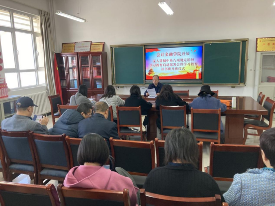 按照此次学习教育的部署安排,会计金融学院党总支成立了“深入贯彻中央八项规定精神学习教育读书班”,此次会议宣布正式开班。学院将以此次读书班为契机开展理论学习与实践探究深入结合,通过专题学习、分组研讨、交流发言等形式,组织学习中央八项规定及其实施细则及《习近平关于加强党的作风建设论述摘编》等内容,将此次学习教育活动与我院作风建设紧密结合,不断提升党员教师素质素养,为学院高质量发展提供有力保障。