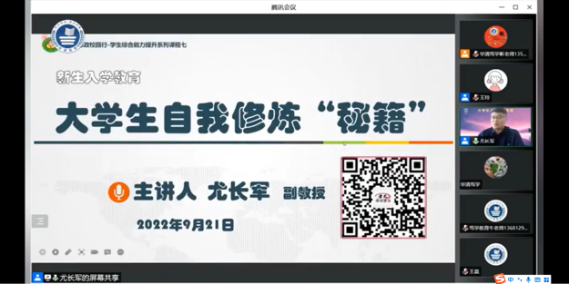 2022年10月6日晚,会计金融学院组织各班在线观看由辽宁省高校辅导员尤长军副教授讲解的《大学生自我修炼“秘籍”》入学教育视频。