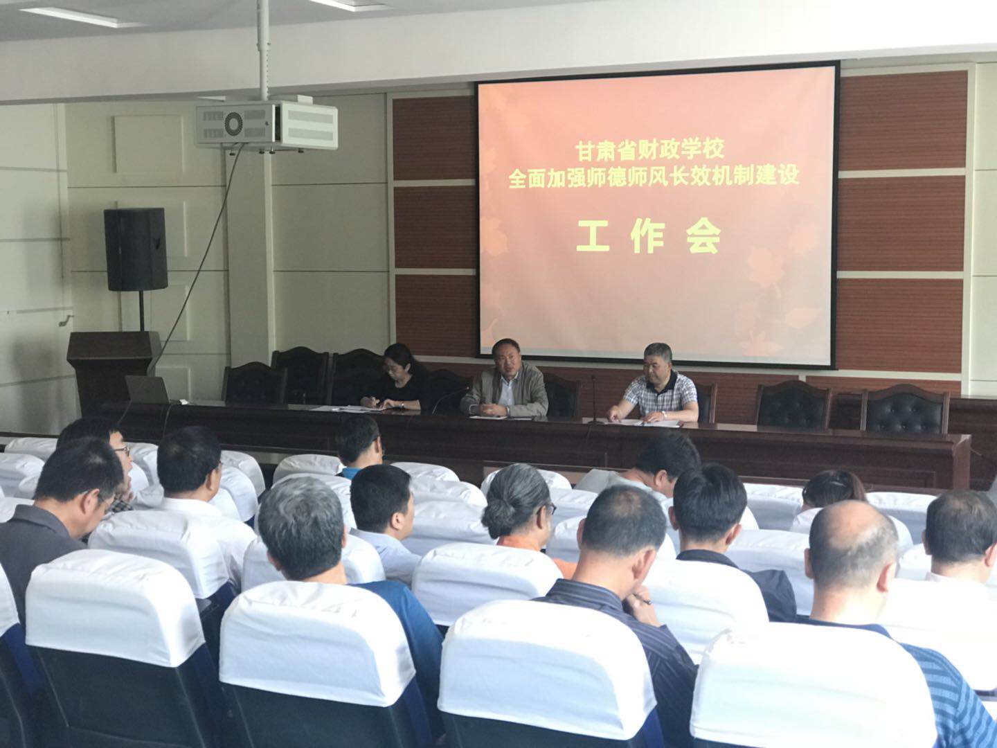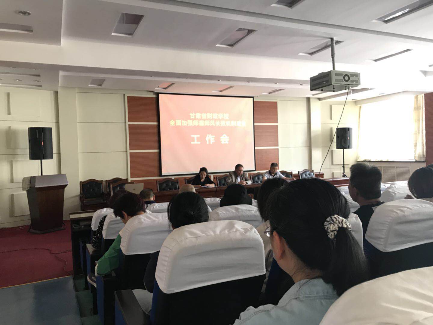 2018年5月8日下午,根据教育厅《关于开展师德师风建设长效机制贯彻落实情况专项督查的通知》文件要求,甘肃省财政学校全体教师在学校多媒体会议室召开 “全面加强师德师风建设长效机制工作会”。会上首先由王丽珍副校长组织学习省教育厅《关于开展师德师风建设长效机制贯彻落实情况专项督查的通知》文件,重点就中小学师德“十条红线”贯彻落实情况做了我校教师在职业倦怠方面的自查通报。紧接着由教务科科长谷克嘉组织学习省教育厅《关于实施中小学教师师德考核负面清单制度的通知》文件及中小学教师十条禁令。最后由金校长部署学校师德建设和迎接督查检查工作,并提出了要求。