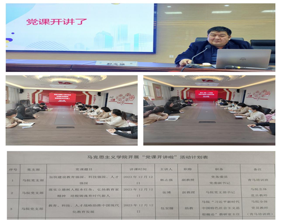 遵照学院主题教育计划,马克思主义学院党支部坚持把“学思想”作为首要任务贯穿始终,充分运用“党课开讲啦”活动载体,精心制定了“马克思主义学院党课开讲啦”计划,通过“领导干部讲”“支部书记讲”“青年党员讲”三个层级讲党课方式,安排了郭志强等五名党员干部讲党课,把党课讲到党员干部教师和青马班的青年学生身边去,扩大了党课受众的覆盖面,增强了党课教育的广泛性,抓实学习教育。党课内容聚焦主题,重点讲好党的创新理论、教育强国、伟大建党精神内涵解读等,以大众话促大众化,让党员、教师和青年学生听得懂、听得进,推动主题教育走心走深走实,见行见效。