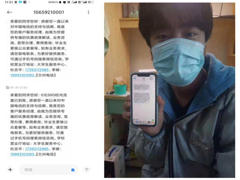 疫情防控、人人有责,线上教学、网络支撑。为更好的服务和保障在校学生线上学习,减轻学生疫情期间网络学习负担。实训信息中心积极与兰州电信职教园区分局充分沟通协商,由兰州电信自10月份开始,免费为我院20、21级在校学生提供“50GB校内流量”,持续至学院恢复线下教学。切实保障广大在校学生的正常学习,保证线上学习不掉线,助力网上教育教学工作平稳有序开展。