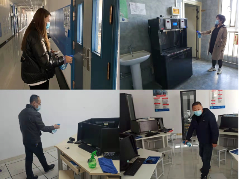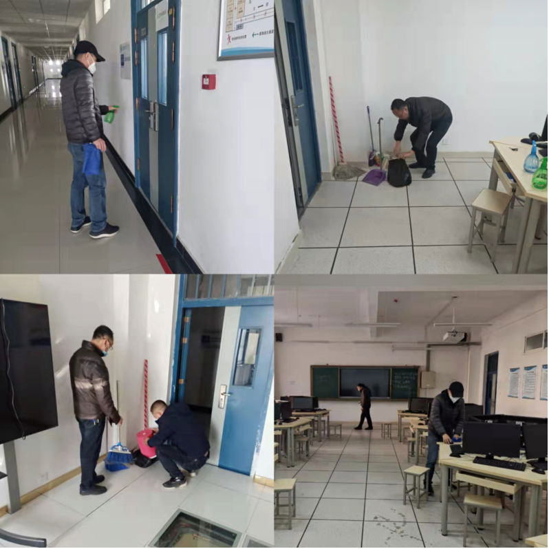 实训信息中心和物业公司齐动手,分工合作,对办公、教学区域进行全面清扫和消杀。从地面到墙面,从办公桌椅到文件柜,从室内到室外走道,从窗户到门框等均不漏掉,做到不留死角。相信在全体工作人员的共同努力下,我们将全力以赴做好疫情防控与教育教学工作。