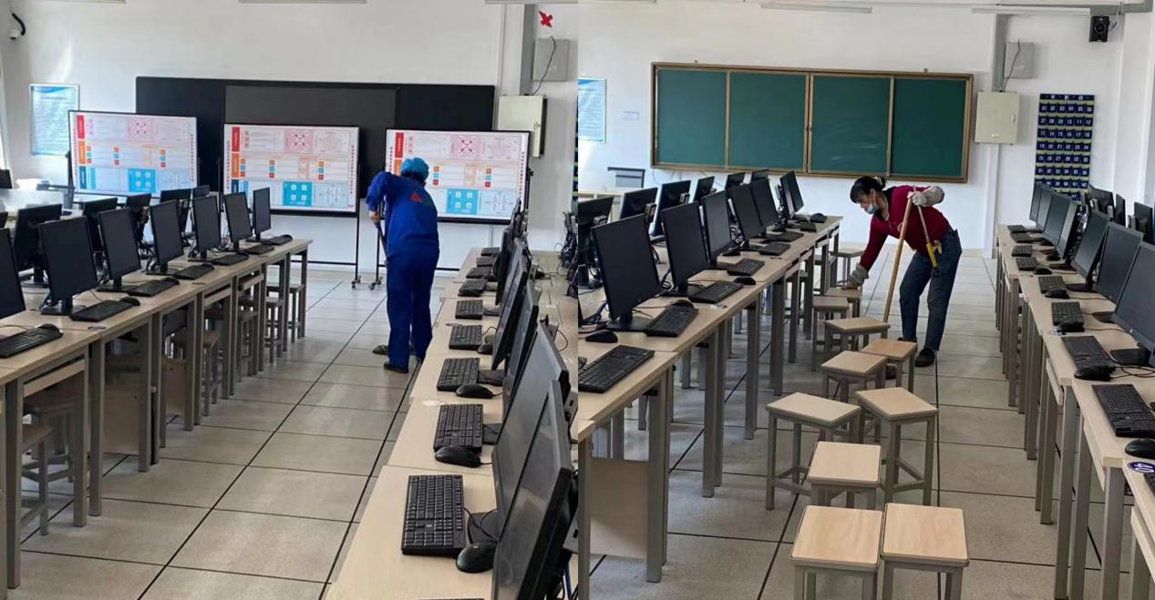 实训信息中心联合物业公司对赛场进行全面清扫,做到不留死角。在全体工作人员的努力下为参加比赛的师生营造舒适环境。
