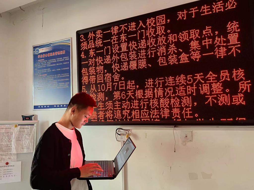 校园LED电子显示屏在学校的文化建设方面起着重要作用,逐渐成为学校校园文化建设宣传主要窗口之一。我院自建设LED电子显示屏系统以来,实训信息中心工作人员长期积极协助各部门及二级学院发布相关宣传信息,包括学生公寓、食堂、教学楼、实训楼、学校南门,特别是疫情期间能够做到全力保障,快速响应,在政治宣传、制度宣传、校企合作、属地管理、对外交流、疫情防控宣传等多方面充分发挥了作用,以实际行动助力我院校园文化建设。
