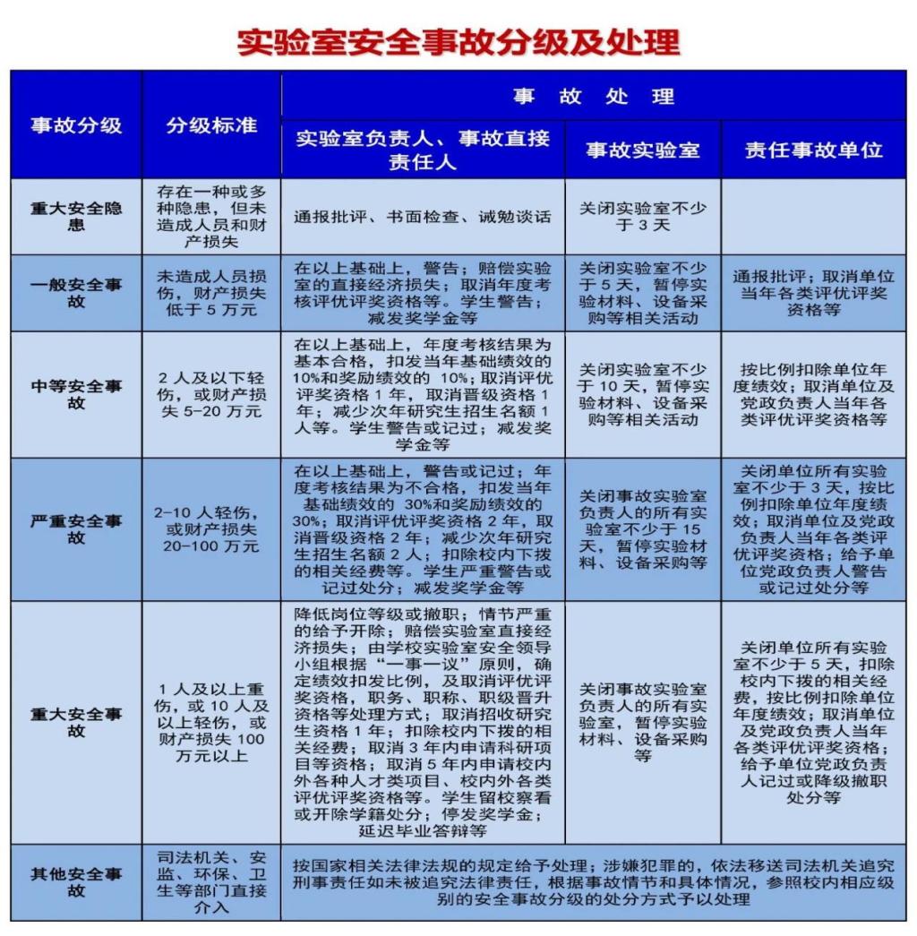 (一)发生国家保密科研信息泄密、环境污染等由司法机关、安监、环保、卫生等部门直接介入的其他安全事故,事故直接责任人、实验室负责人、事故单位负责人、职能部门负责人、学校相关领导等按国家相关法律法规的规定给予处理;涉嫌犯罪的,依法移送司法机关追究刑事责任。如未被追究法律责任,根据事故情节和具体情况,参照校内相应级别的安全事故分级的处分方式予以处理。