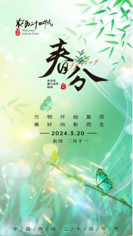 春分是二十四节气之一,是指每年农历二月十五日前后,传统以立春到立夏之间为春季,而春分正处于两个节气之中,平分了春季。春分的意义有两个方面:一是指是“昼夜平分”,在春分这天,太阳直射赤道,昼夜等长,各为12小时。春分在天文学上也有重要意义,它标志着太阳直射位置由赤道向北半球推移,北半球各地白昼开始长于黑夜,南半球与之相反;二是指古时以立春至立夏为春季,春分正当春季三个月的中间。