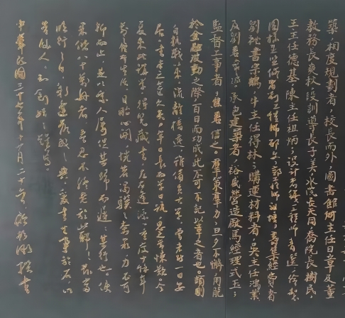 堂之筑,相度规划者,校长而外,图书馆何主任日章及董教务长爽秋,段训导长子美,水院长天同,乔院长树民,王主任德基,陈主任祖炳;设计者钱工程师青选;绘制图标幷监修者刘工程师郁文,郭工程师祖培;筹集经费者刘秘书宗鹤,牛主任得林;购运材料者吴主任鸿业及刘君希诚;承包建筑者,裕盛营造厂马经理式玉;监督工事者焦君信之。群策群力,旦夕不懈,用能于金融波动之际,百日而功成,此不可不记以章之者也,颉刚自抗战以来,流离播迁,虽备员大学,曾未能一日安居,书本之荒久矣,年日长而学日疏,思之常悚歉。今夏来此讲学,得览藏书,左右逢源,重度十余年前之铿研生活,日眙心开,恍若渴骥之奔泉,力不可抑而止,是以家人屡促其归还迟迟,其行也。使采储八十万册者,吾忍不终老于此耶!兹当临行之日,躬逢落成之典,爰书其事于石,以告后人,知创始之难焉!