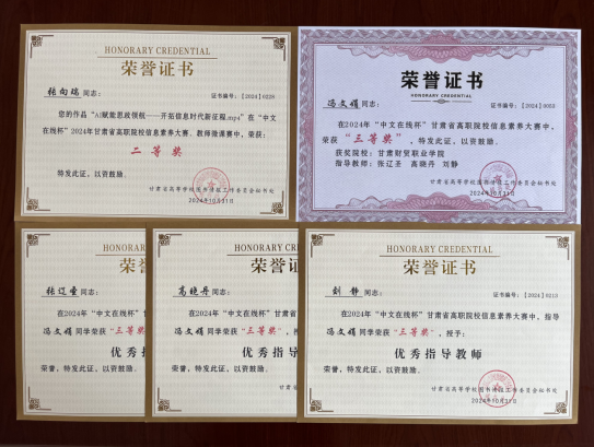 10月31日,由甘肃省高校图工委举办的“2024年甘肃省高职院校信息素养大赛”圆满落幕。学院图书馆积极组队参加比赛,通过学生组比赛成绩判定与教师组微课作品初筛、专家评审判定,我院教师张向瑞作品《AI赋能思政领航——开拓信息时代新征程.mp4》在教师微课赛中荣获二等奖,学生冯文娟荣获三等奖,张辽圣、高晓丹、刘静3位教师荣获优秀指导教师。