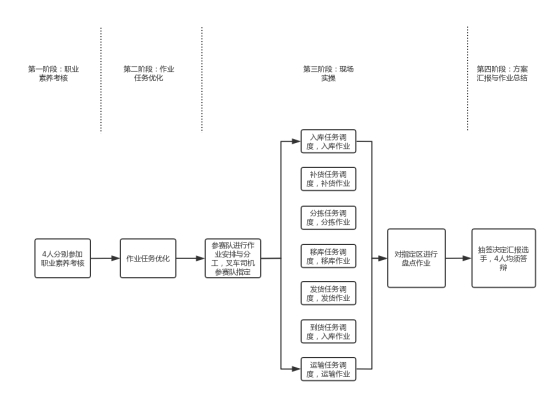 职业技能考核通过作业任务优化和作业调度与实施两个部分来考核参赛队仓储、配送、运输、规划、作业安排、团队协作、现场应变等综合技能和素养,全面的作业内容和复杂的现场协同也考察了参赛队的体能和抗压能力。
