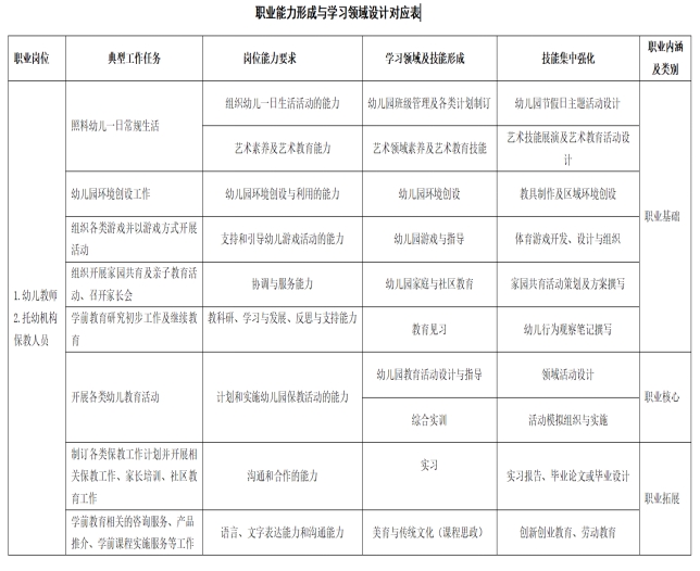 根据幼儿教师岗位需求,考虑到幼儿教师的典型工作任务与核心能力要求,确定本专业的职业领域如下表。