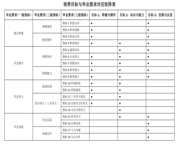 目标1:师德与情怀。理想信念坚定,主动践行社会主义核心价值观,自觉贯彻党的教育方针,坚守“立德树人”根本任务;道德情操高尚,热爱学前教育事业,认同幼儿教师价值,深刻理解并践行“幼儿为本”的专业理念;具备科学的儿童观,富有仁爱之心,熟悉先进的学前教育理念,扎根一线,成为幼儿全面健康发展的支持者、合作者和引导者。