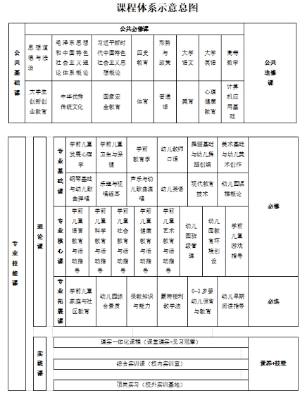 学前教育学、幼儿园教育活动设计与实施(语言、健康与社会、科学、艺术)、学前儿童游戏、早期阅读与指导、幼儿教师音乐技能、幼儿教师舞蹈技能、幼儿教师美术技能、教师口语、教育见习、综合实习实训、顶岗实习 |