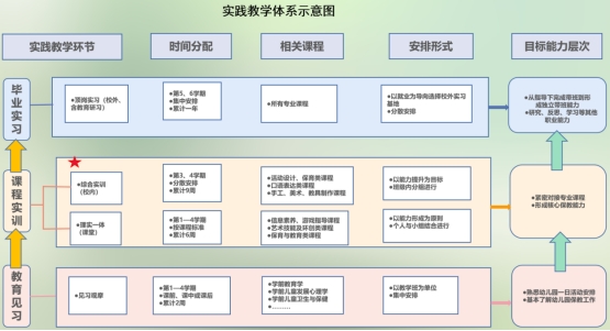 幼儿园课程概论、学前儿童游戏、学前儿童发展心理学、蒙台梭利教学法、教育见习、综合实习实训、顶岗实习 |