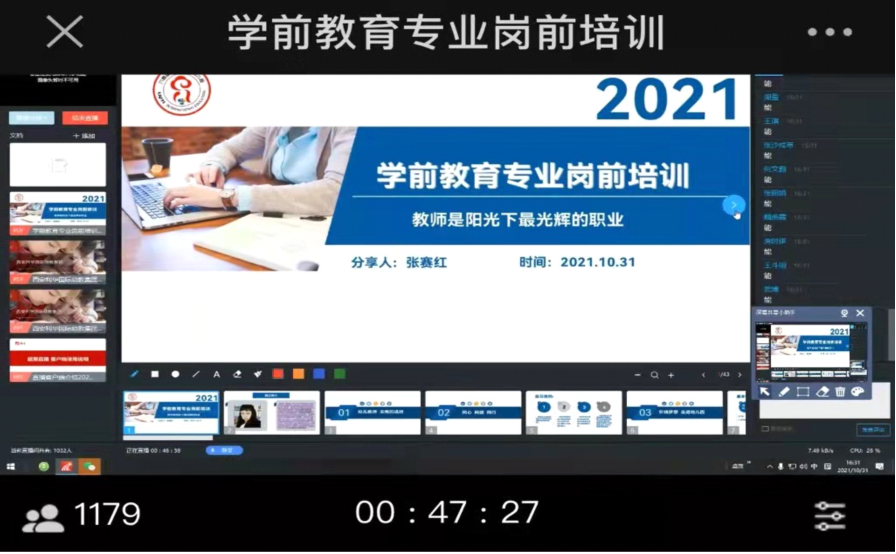 在全院师生众志成诚,共抗疫情的重要时刻,按照学院封校不停课的要求,为丰富学生疫情期间线上课堂形式,我院邀请西安大秦幼儿园张赛红园长(兼任国际语言习得与精确教育研究中心(CLAPE中心)特聘专家;意敦兰德教育特聘专家;中-加-美合作项目浸入式双语实验研究课题组组长;多次出访加拿大、美国、韩国、新加坡、香港,澳门及国内多省市进行学术交流活动),为学前教育专业全体学生做了题为《教师是阳光下最光辉的职业----学前教育专业岗前培训》的精彩讲座。
