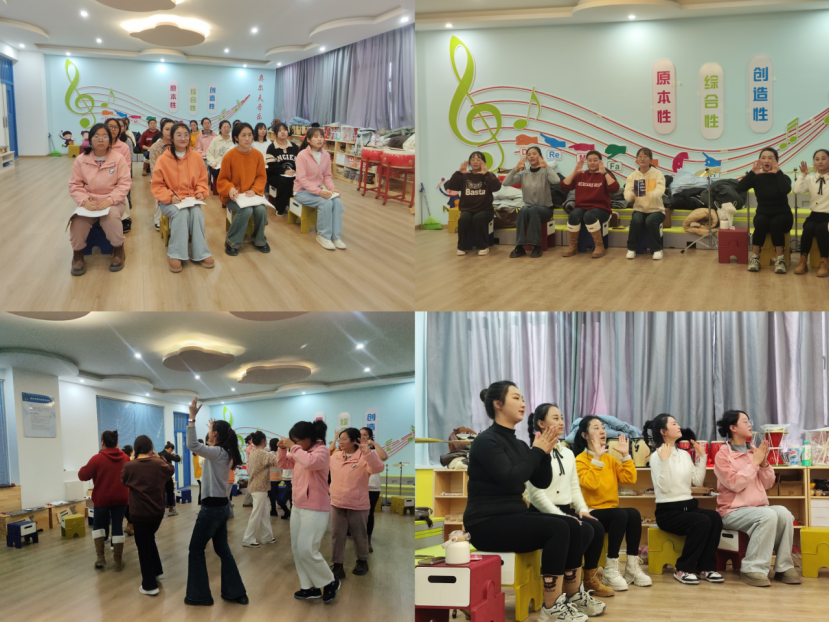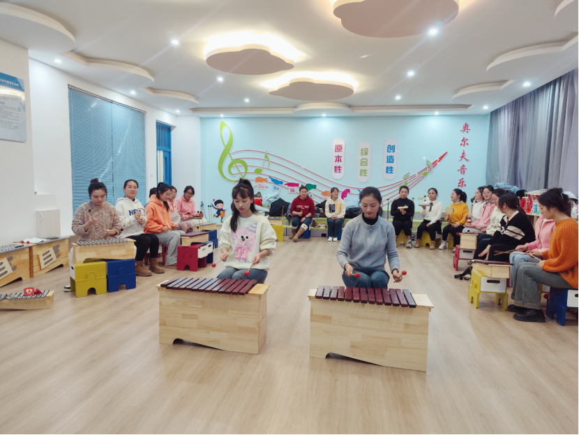 此次培训,旨在提升我院校企合作单位的相互协作、促进与长期合作、发展空间。培训课程分为理论与实操两部分:理论部分主要阐述奥尔夫音乐教学理念与方法。通过学习,使参训教师对奥尔夫生平、奥尔夫音乐教学法的基本原理、教学内容与教法有了更加清晰、系统的认知。实操部分包含八个项目的实训指导。参训幼儿教师通过声势组合训练、语言节奏训练、音乐律动活动、歌唱与听力练习以及奥尔夫乐器合奏展示等模块的学习,深入理解了奥尔夫音乐教育在幼儿早期音乐教育教学活动中的重要地位。领会到奥尔夫音乐以节奏为基础,紧密结合动作、舞蹈、语言,通过综合性的表现形式,充分体现出奥尔夫音乐教育教育体系创造性、原本性、即兴性的教育原理。