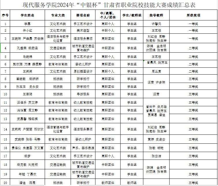 近日,由甘肃省教育厅、省人力资源和社会保障厅、省财政厅、省卫生健康委员会、省总工会、甘肃中华职业教育社举办的2024年“中银杯”甘肃省职业院校技能大赛圆满落幕。我院师生在此次比赛中取得了突破性成绩,斩获省级一等奖3项、二等奖4项、三等奖13项等多项殊荣,同时入围了国赛赛项3项。