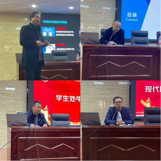 在此次会议上,心理咨询中心主任聚焦学生干部的沟通协调与冲突管理能力,指出当前学生干部协调能力有待提升,阐述了倾听、表达、察言观色的重要性,强调团队合作要点并分享情绪管理方法;学生处处长肯定学生干部的桥梁作用和奉献精神,提出以学业为重、服务优先、重视团队协作与创新的期望;现代服务学院学管院长批评学生干部工作问题,要求以身作则、强化服务意识,还提出遵守校规、加强自我管理、提升服务能力等要求;现代服务学院党总支书记宣布团总支书记人事调整,分享学生干部角色定位与价值,以“积极奉献,乐于服务;严于律己,以身作则;公平公正,一身正义;做好助手,善于沟通”32字提出期望,要求提升综合素质、发挥模范作用 。
