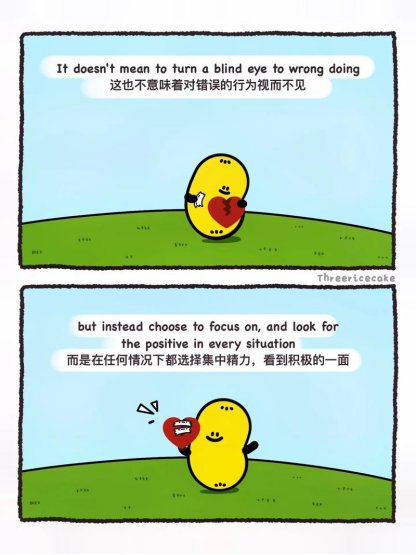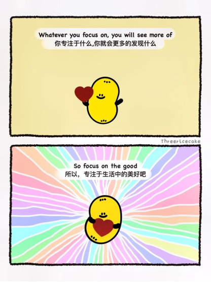专注于美好的事物,看见自己所拥有的。如果我们把这个生活态度铭记于心,我们的人生将如何转变?如果在街上走路或开车时,开始寻找美丽和让我们欢喜的事物,会怎样?当跟别人在一起时,如果把焦点放在关爱上,而不是批评上,会怎样?在生活中,如果把心思集中在开心有趣的经验上,而不去想惹恼我们的事,会怎样? 当我们经常这么做,就是在为这个世界带来更多美好的事物,同时也为自己的生命带来更多美好。