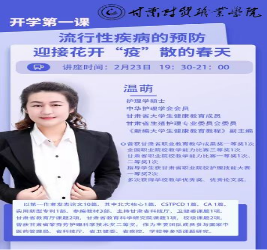 为有效预防春季常见传染病的发生,进一步提高全体师生对常见传染病的防控意识,日前,学院特邀甘肃卫生职业学院护理学硕士、中华护理学会会员、甘肃省大学生健康教育成员温萌,通过钉钉视频为全院师生开展“开学第一课”——流行性疾病的预防,迎接花开“疫”散的春天健康知识讲座。我院12000余名师生在线观看了讲座。