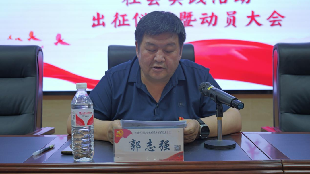 学院党委副书记郭志强在动员讲话中表示,希望同学们以饱满的热情和积极的态度投身到社会实践中去,明确使命责任、锤炼品格能力,在服务人民、奉献社会中彰显“财贸学子”的青年担当。随后,郭志强为社会实践团队授旗并宣布出征。