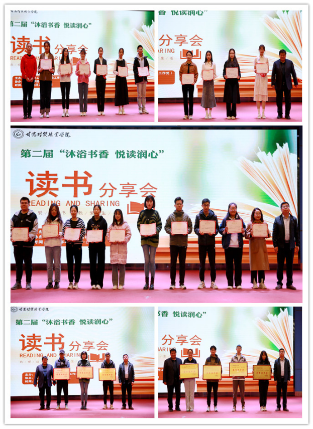 经过悦读和分享,共评选一等奖4名、二等奖6名、三等奖10名;优秀指导教师10名;优秀组织单位3个,书香进步单位3个。学院领导为获奖个人及二级学院颁奖,并与读书爱好者合影留念。