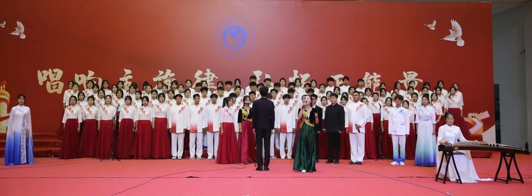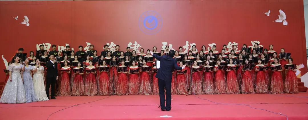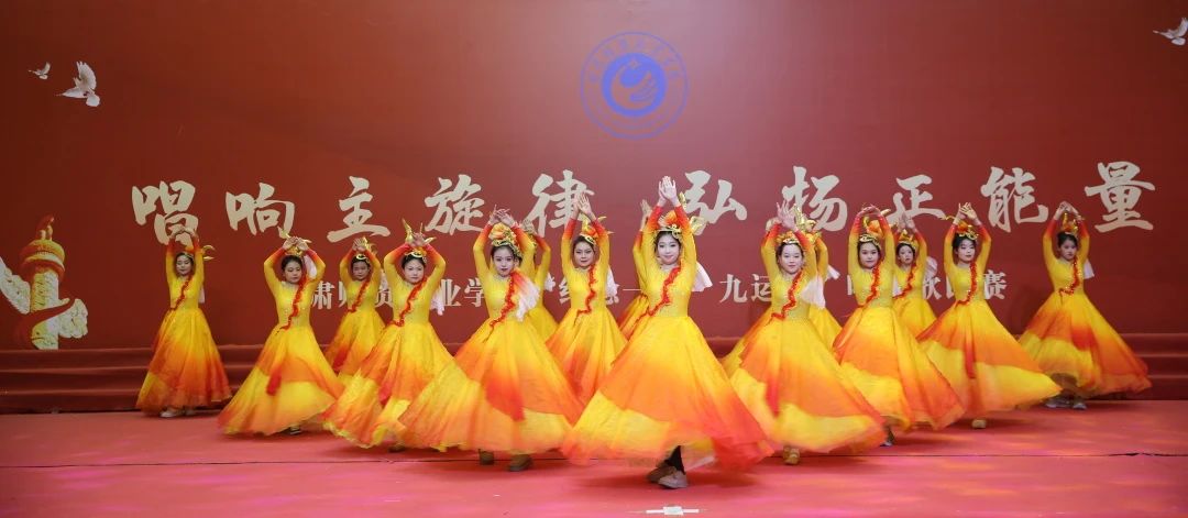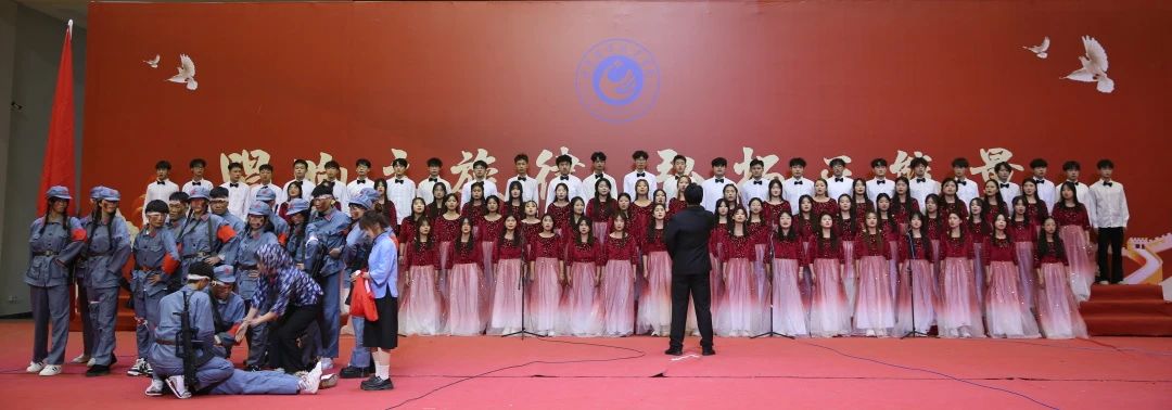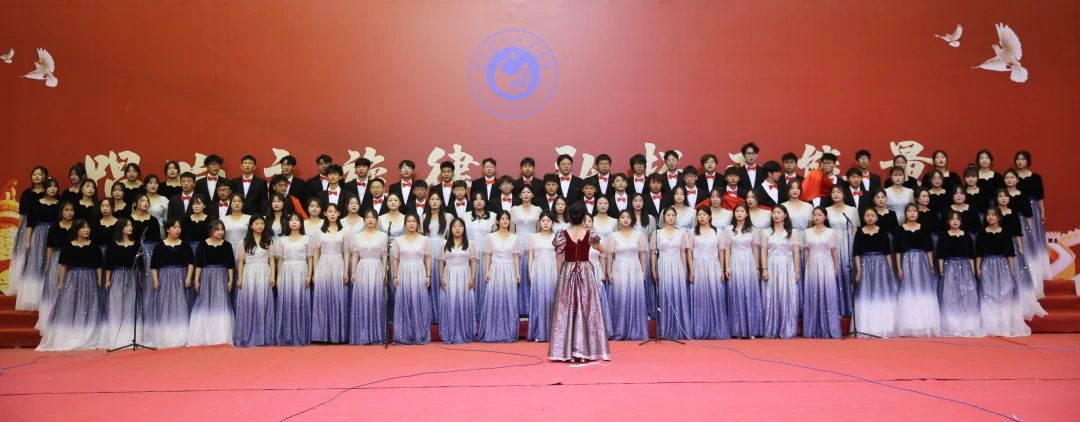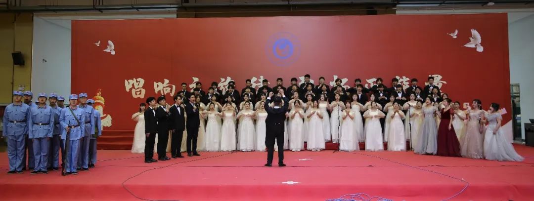 在热烈的掌声中,合唱《桃花红・杏花白》拉开了比赛的序幕,7 支二级学院代表队依次上台表演。合唱队员们以真挚的情感和嘹亮的歌声,诉说着那个风雨飘摇、民族危亡的年代,革命先烈们救亡图存的故事。比赛中还穿插了《星星之火》《天耀中华》《不忘初心》等舞蹈表演。