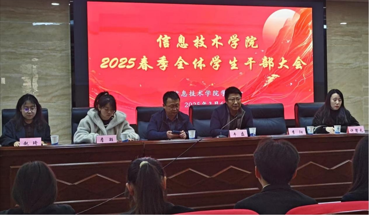 2025年3月6日下午,信息技术学院召开2025春季学期第一次全体学生干部大会。本次大会旨在加强学生干部队伍建设,明确新学期工作目标,激发学生干部的工作热情。学生处处长牛磊、心理健康服务中心主任程活、校团委书记詹颖、学院支部书记李阳、学院学管副院长许馨元出席大会,信息技术学院团总支书记赵琦主持会议,学院200余名学生干部参会。