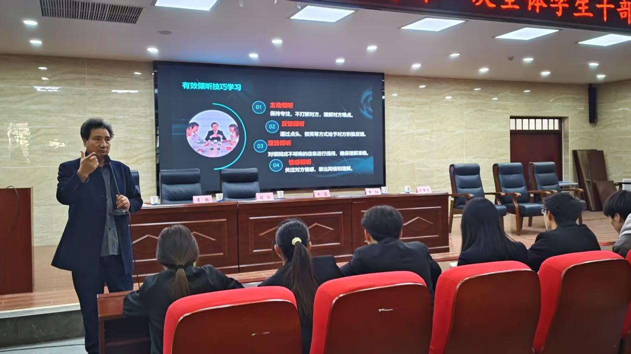 心理健康服务中心程活主任通过案例分析,传授学生干部的沟通技巧与领导力,为学生干部筑牢心理健康防护网并提供专业支持。学生处处长牛磊在讲话中强调了作为学生干部的先锋作用,从全局角度提出学生工作开展要求,鼓励学生干部在智慧校园建设中勇当"技术尖兵"。校团委书记詹颖部署了本学期共青团工作安排,并要求学生干部应廉洁自律,守住纪律底线。