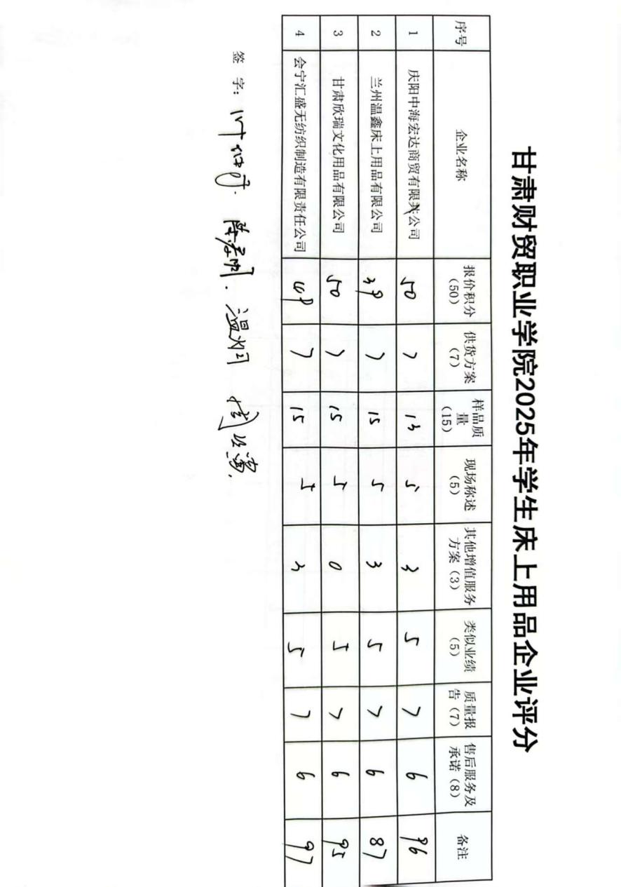 2025年8月5日前共有四家企业对yl88858cc永利官网2025级学生公寓床上用品供应商遴选项目递交响应文件。根据yl88858cc永利官网2025级学生公寓床上用品供应商遴选项目的磋商招标流程,学院于2025年8月5日对学生公寓床上用品供应商遴选项目组织了竞争性磋商,经资格审查、技术评审及现场磋商,现将本次磋商的结果及评分情况公示如下: